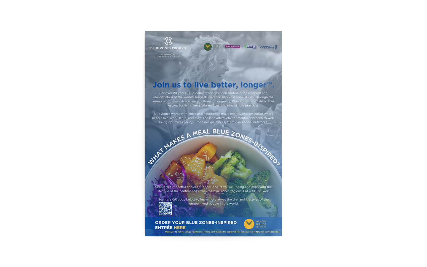 This set of posters was created as part of a marketing campaign for Blue Zones Project Scottsdale. The goal was to produce three variations that conveyed the overarching messaging of the poster (i.e., Blue Zones’ approach to food and nutrition), included a call-to-action prompting readers to make a healthy, Blue Zones-inspired meal choice, and aligned with the brand guidelines. I created one variation featuring the target avatar, one featuring a Blue Zones-style meal, and one featuring both the avatar and a meal — to test which messaging would resonate most effectively.